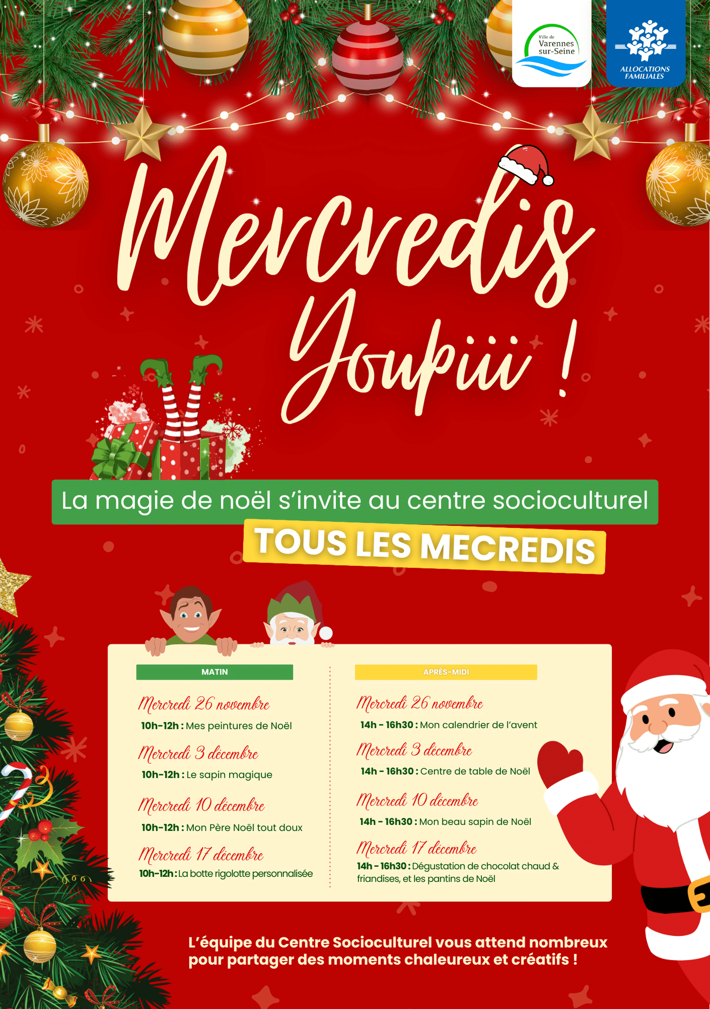 Le Centre Socioculturel propose des ateliers festifs pour les 2–5 ans le matin, et pour tous les publics l’après-midi, les mercredis du 26 novembre au 17 décembre.
